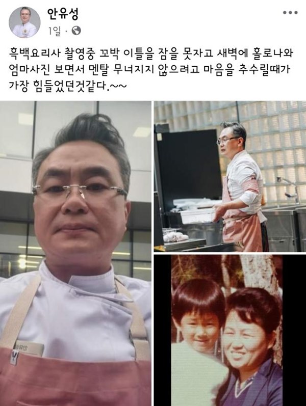 안유성 셰프는 자신의 페이스북에 “‘흑백요리사’ 촬영 중 꼬박 이틀을 잠을 못 자고 새벽에 홀로 나와 엄마 사진 보면서 멘탈 무너지지 않으려고 마음 추스를 때가 가장 힘들었던 것 같다”라는 글을 올렸다.